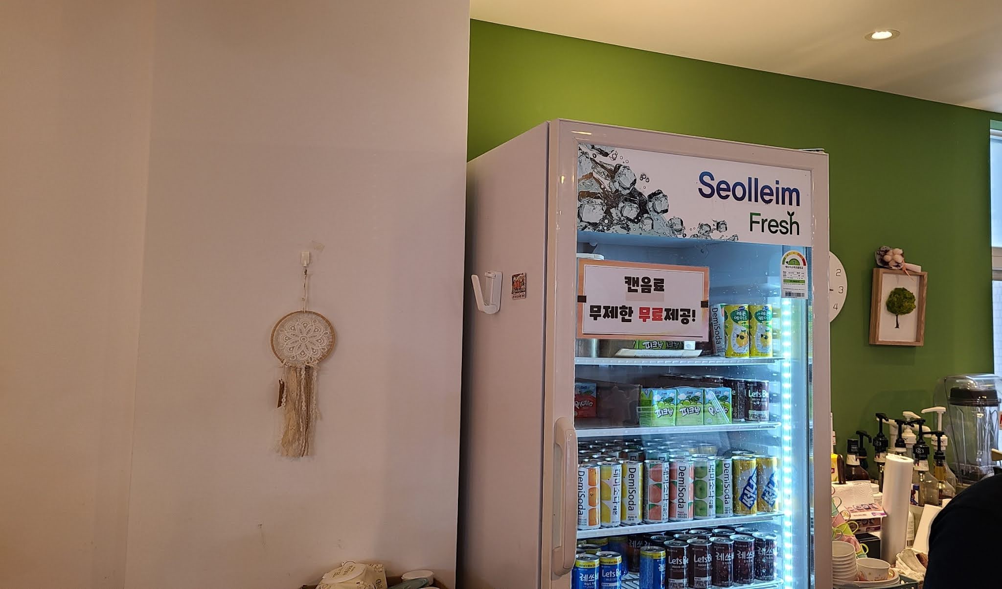 냉장고에 비치되어 있는 캔음료, 팩음료는 모두 무제한 무료 제공 됩니다. 아이들을 위해서닌 피크닉(사과, 포도 등) 음료가 준비되어 있고 레몬에이드, 데미소다, 레스비 등의 캔음료와 캔커피는 달라고 하면 계속 주십니다. ^^
